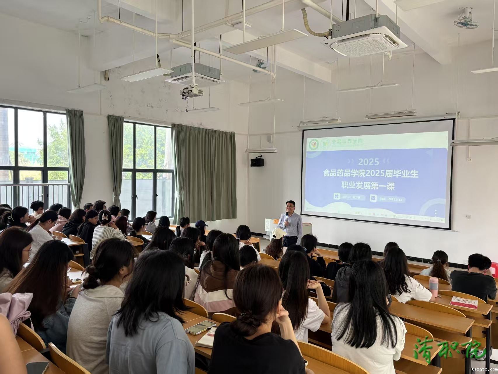 党总支副书记、院长程天德聚焦培养大国工匠、能工巧匠、高技能人才主题,从行业前景、职业路径、成长建议、展望未来成就精彩人生等方面分享了食品和药品专业发展的趋势、路径,并给予指导建议,帮助学生更好地做好职业发展规划,促进学生可持续发展。
