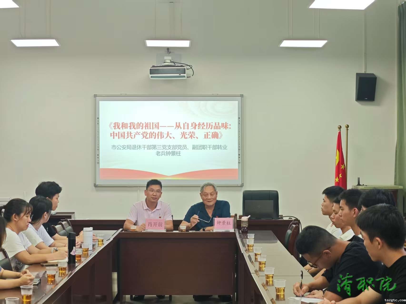 机电与汽车工程学院同步开展退役军人座谈会。市公安局退休干部第三党支部党员、副团职转业老兵钟景柱以《我和我的祖国——从自身经历品味:中国共产党的伟大、光荣、正确》为题,结合自身从军19年,从警23年的经历,分享三次参战报国的历程、军营生活的磨炼,以及退役后保持本色继续奉献的故事。并用“经历就是财富,学习就能进步,总结就能创新”的人生感悟,点燃学子参军报国热情。互动交流环节中,退役学生代表黄启轩、潘斌杰回顾军旅生活与成长收获;有意应征入伍的学生围绕“征兵政策条件”踊跃提问。